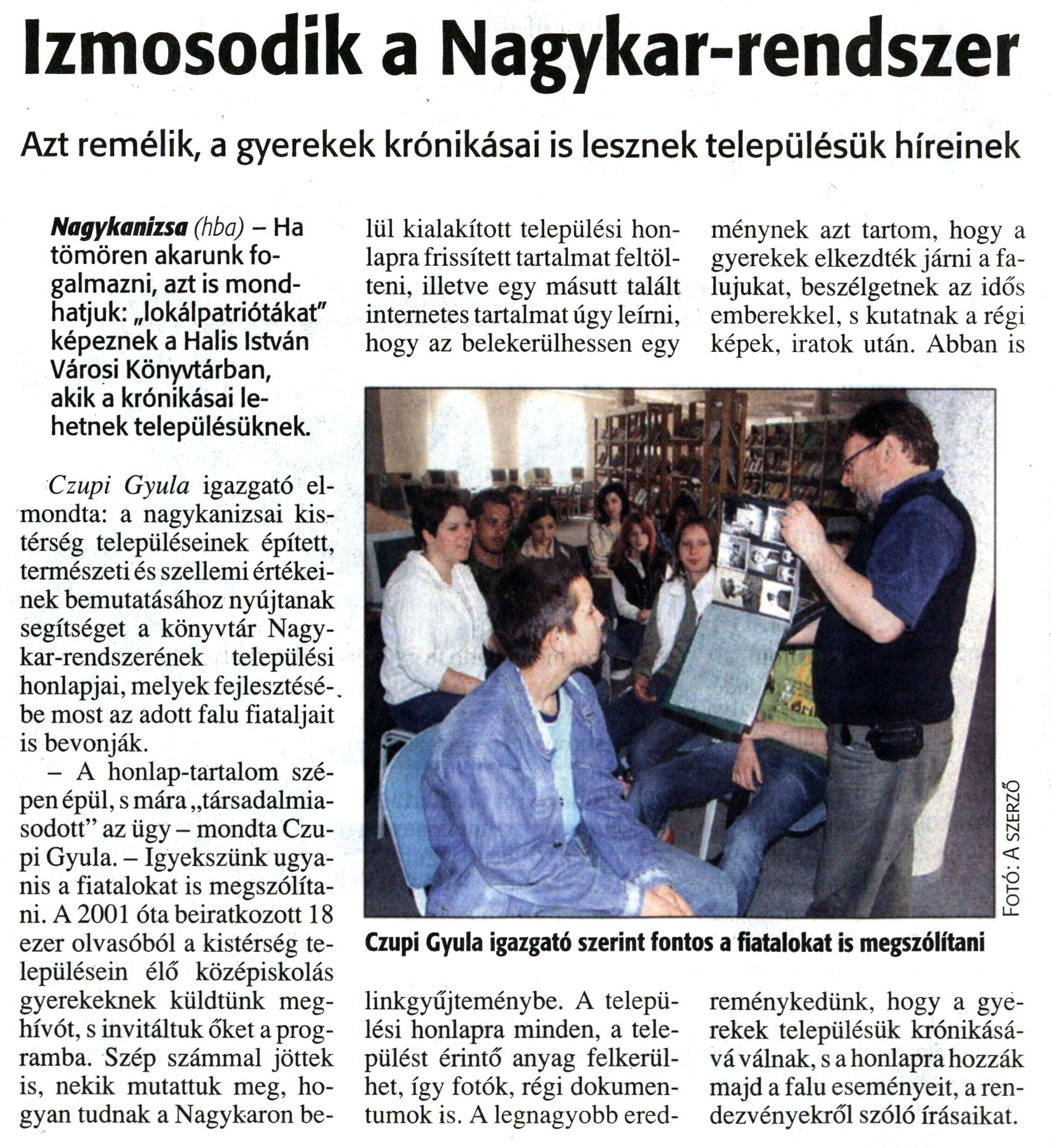 Nyilvános 14311 | 28556 | Zalai Hírlap 2008. június 9. 133. szám 12. oldal - Izmosodik a Nagykar-rendszer | A cikk szövege: Izmosodik a Nagykar-rendszer Azt remélik, a gyerekek krónikásai is lesznek településük híreinek Nagykanizsa (hba) - Ha tömören akarunk fogalmazni, azt is mondhatjuk: „lokálpatriótákat" képeznek a Halis István Városi Könyvtárban, akik a krónikásai lehetnek településüknek. Czupi Gyula igazgató elmondta: a nagykanizsai kistérség településeinek épített, természeti és szellemi értékeinek bemutatásához nyújtanak segítséget a könyvtár Nagykar-rendszerének települési honlapjai, melyek fejlesztésébe most az adott falu fiataljait is bevonják. - A honlap-tartalom szépen épül, s mára „társadalmiasodott" az ügy - mondta Czupi Gyula. - Igyekszünk ugyanis a fiatalokat is megszólítani. A 2001 óta beiratkozott 18 ezer olvasóból a kistérség településein élő középiskolás gyerekeknek küldtünk meghívót, s invitáltuk őket a programba. Szép számmal jöttek is, nekik mutattuk meg, hogyan tudnak a Nagykaron belül kialakított települési honlapra frissített tartalmat feltölteni, illetve egy másutt talált internetes tartalmat úgy leírni, hogy az belekerülhessen egy linkgyűjteménybe. A települési honlapra minden, a települést érintő anyag felkerülhet, így fotók, régi dokumentumok is. A legnagyobb eredménynek azt tartom, hogy a gyerekek elkezdték járni a falujukat, beszélgetnek az idős emberekkel, s kutatnak a régi képek, iratok után. Abban is reménykedünk, hogy a gyerekek településük krónikásává válnak, s a honlapra hozzák majd a falu eseményeit, a rendezvényekről szóló írásaikat. Képaláírás: Czupi Gyula igazgató szerint fontos a fiatalokat is megszólítani |